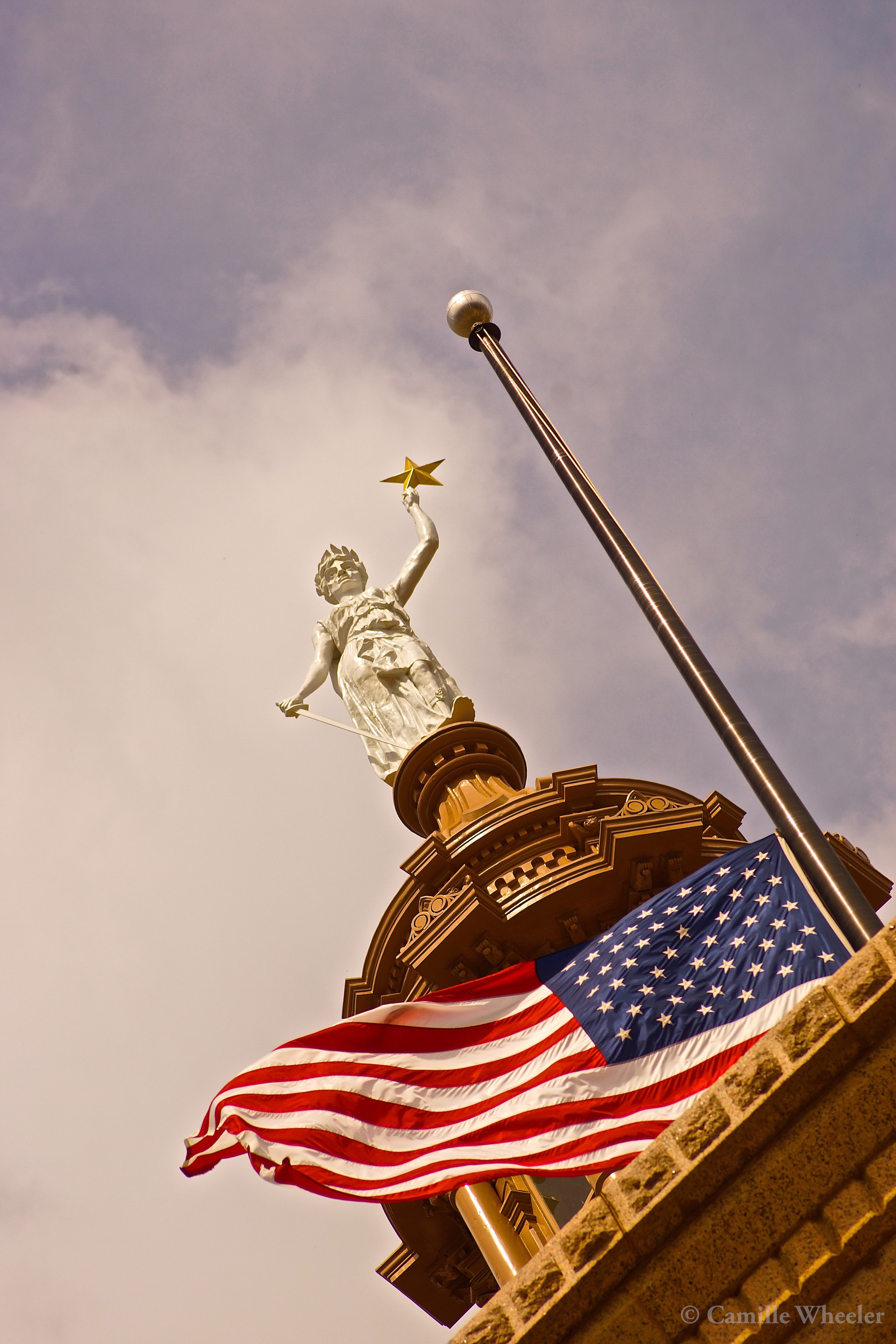 The original and refurbished Goddess of Liberty is on display at the Bob Bullock Texas State History Museum in Austin (www.thestoryoftexas.com). Originally cast of galvanized iron and zinc and coated with paint and sand to simulate stone, she stands almost 16 feet tall and weighs about 2,000 pounds.