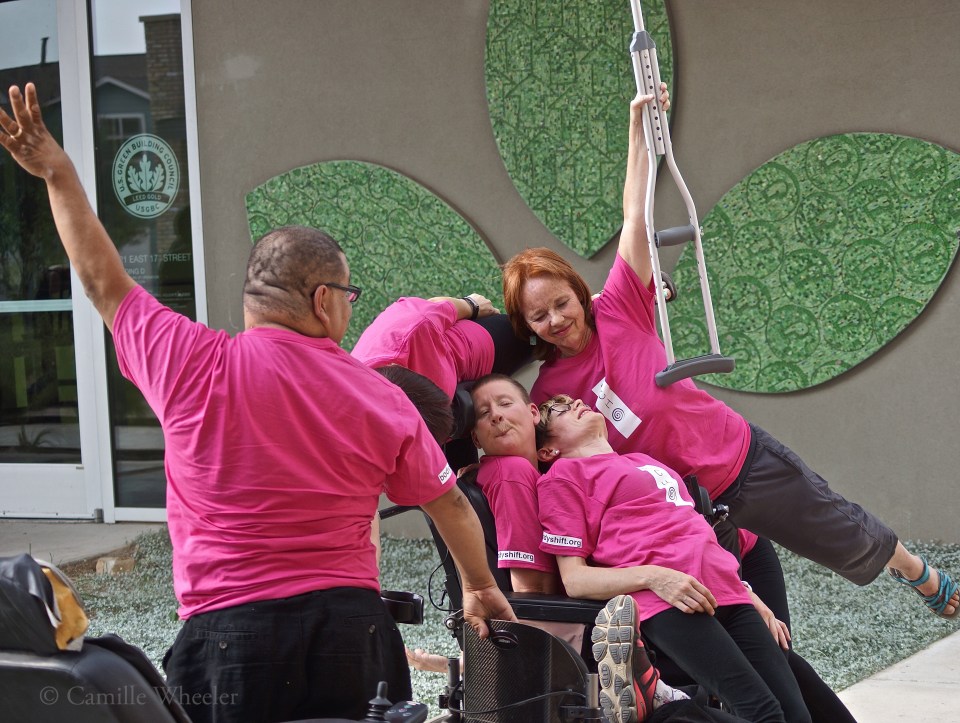 From left, clockwise, Body Shift dancers Juan Munoz, choreographer Silva Laukkanen, Peggy Lamb (holding crutch), Tanya Winters, and Susie Angel (in wheelchair behind Winters) create an image during the Aug. 22, 2015, ECHO performance at xxxxxxxxxxxxxxxxx in East Austin.